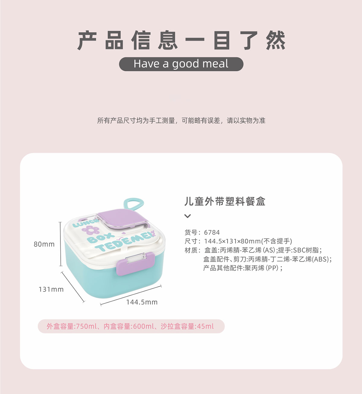 Size: 145*131*80mm/外盒:750ml/內(nèi)盒:600ml/沙拉盒:45ml