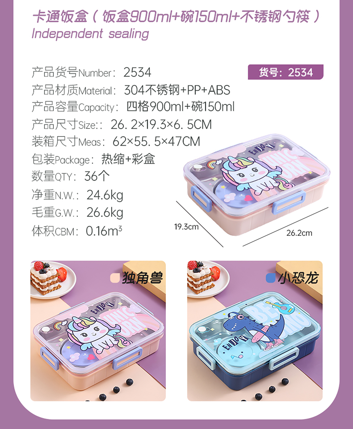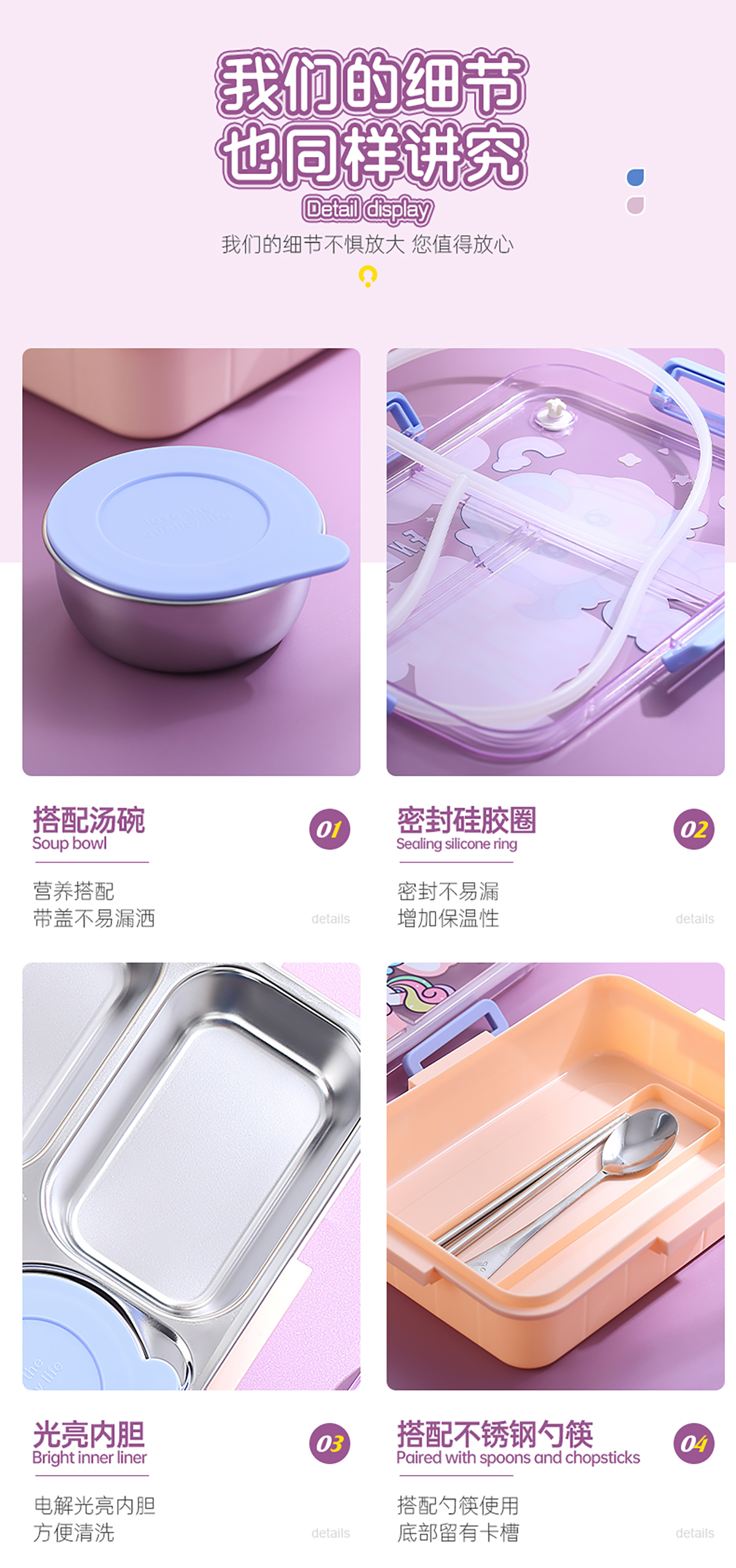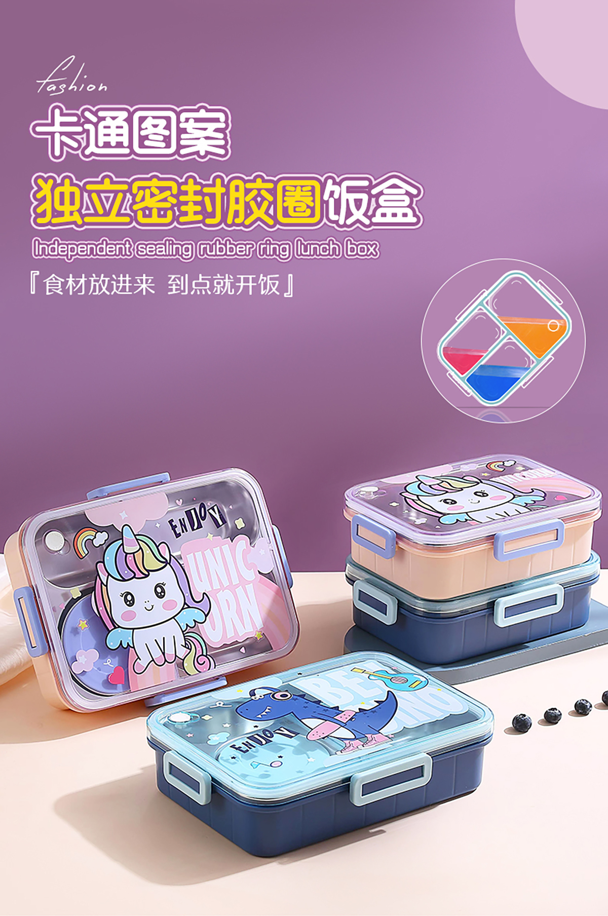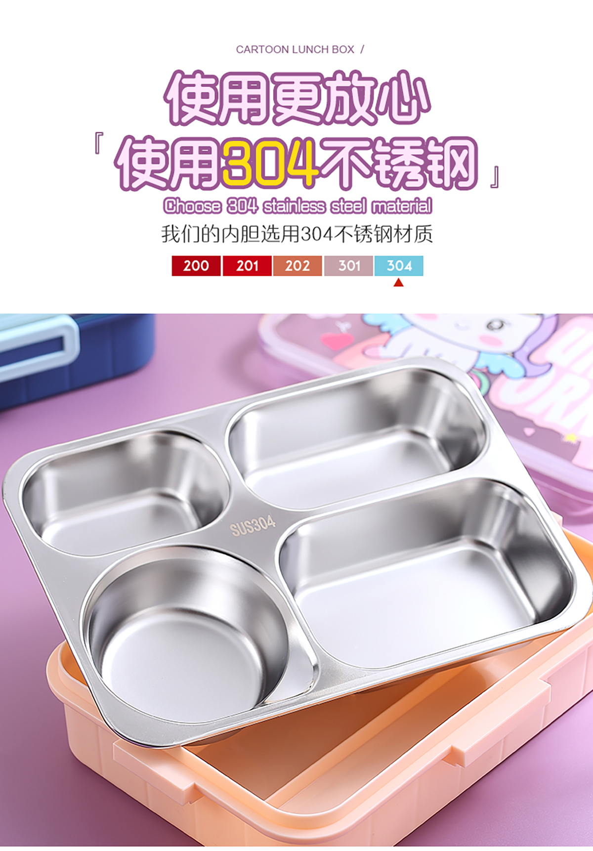 900ml獨(dú)立密封不銹鋼餐盒(卡通四格+不銹鋼勺筷/碗150ml不銹鋼勺筷)