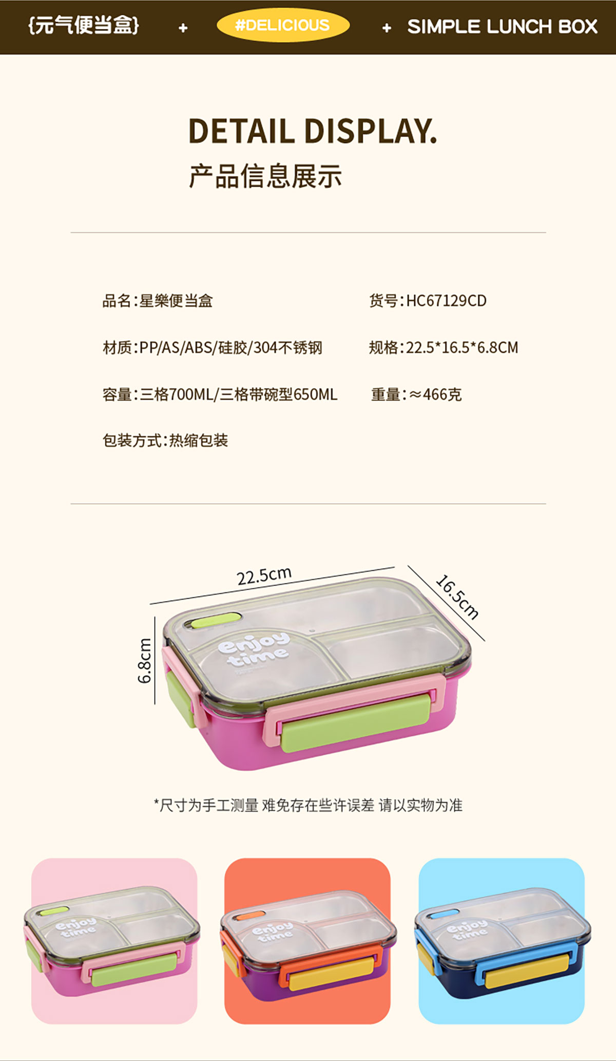 Size: 225*165*68mm(三格700ml/三格帶碗650ml)